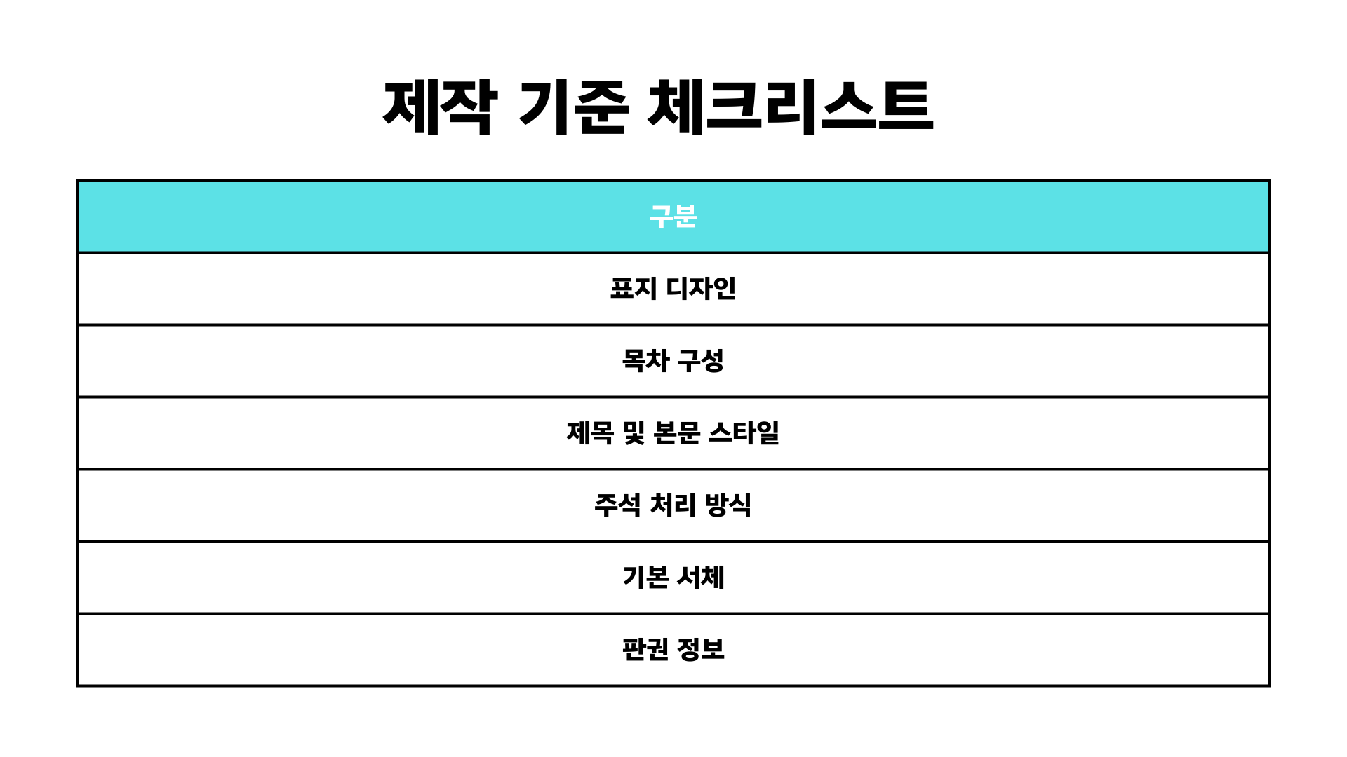 - 체크리스트: 표지 디자인, 목차 구성, 제목 및 본문 스타일, 주석 처리 방식, 기본 서체, 판권 정보 등
